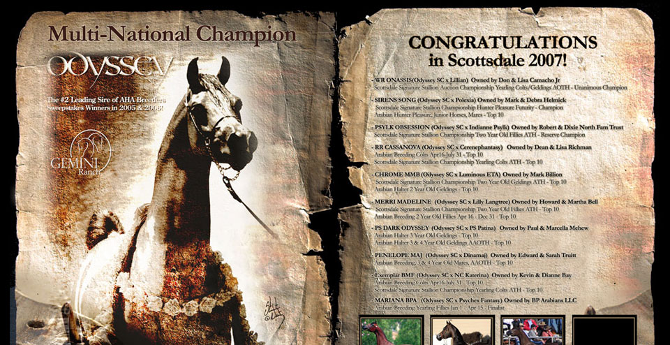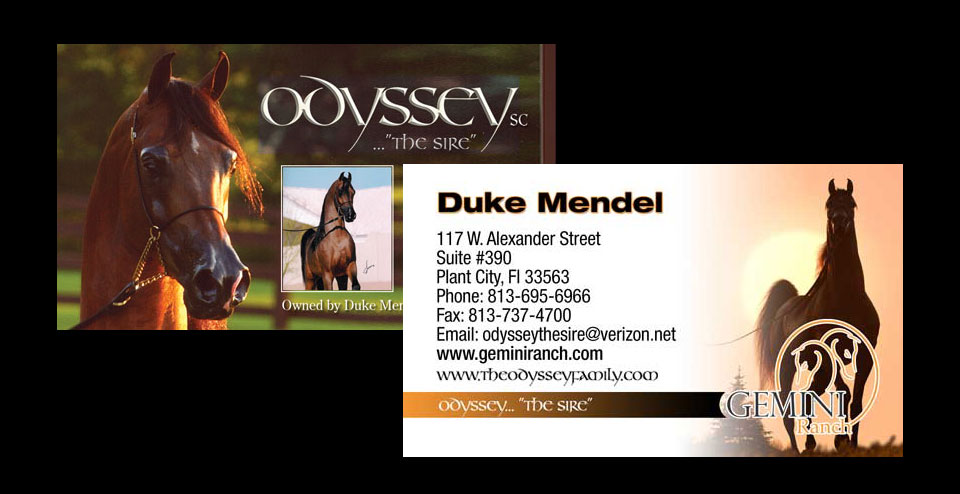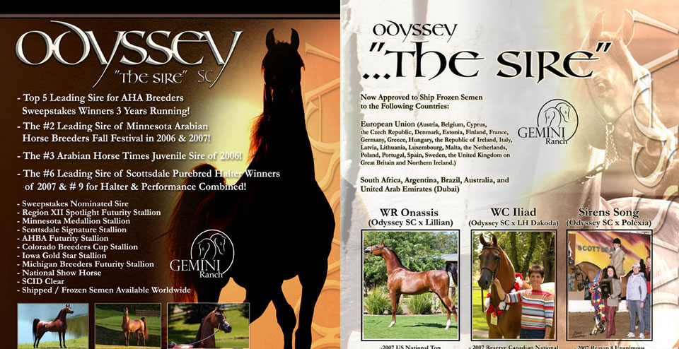 A horse breeder and Arabian Horse aficionado, Gemini Ranch wanted eye catching design of all of their materials using a previously develop brand for their ranch and lead stallion "Odyssey The Sire". A very rugged, yet clean layout was selected for all pieces with a consistent color scheme throughout.